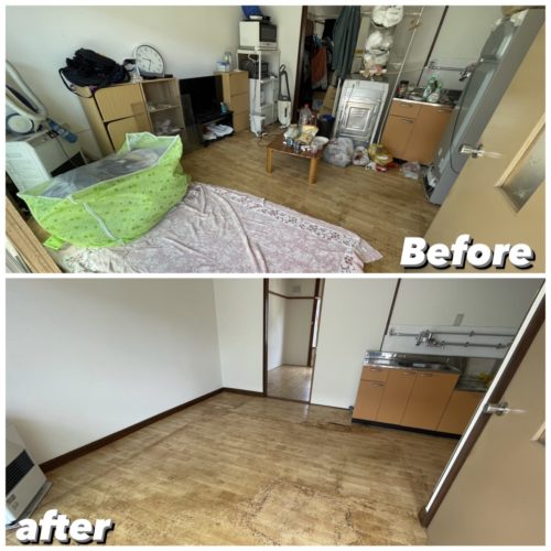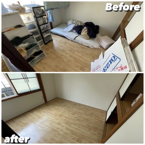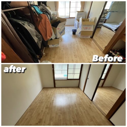 室内消毒とオゾン脱臭後に遺品の仕分けをしながら不要品を搬出、清掃して作業完了、搬出量は約3㌧程となりました。