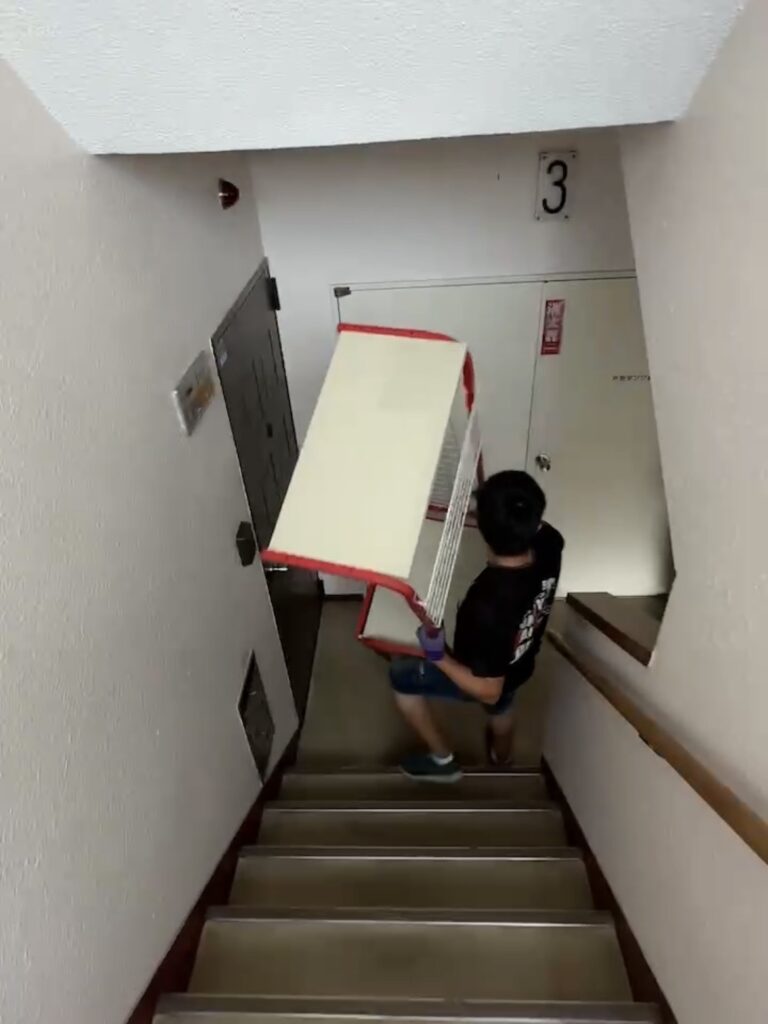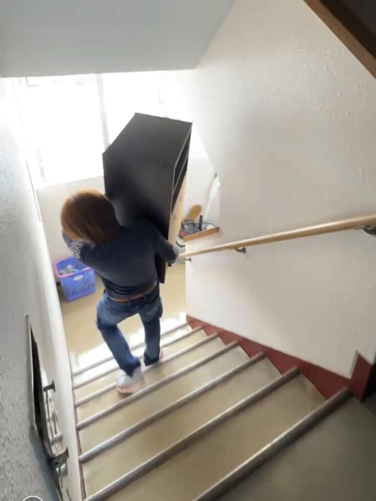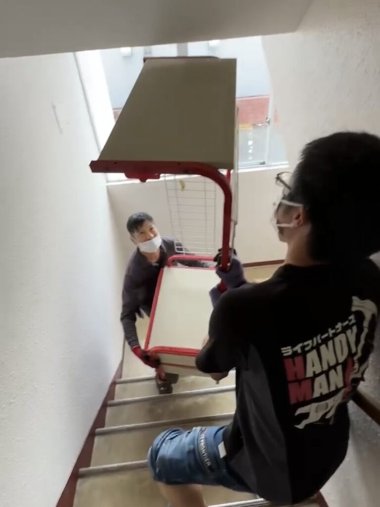 今回の住宅は、4階のエレベーター無しのお部屋でしたので、全て作業は階段を昇り降りになりました。