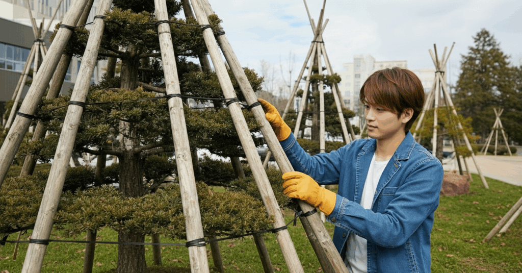 具体的には、木の周りに藁やネットを使って囲いを作り、雪や風からの影響を軽減します。