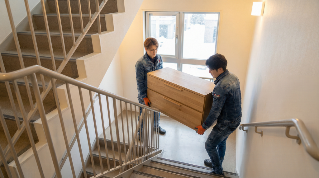 エレベーターのないアパートでは、階段作業が避けられません。