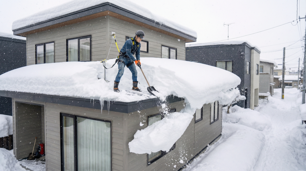 雪は降りたてのときは軽く見えても、気温の変化で氷の層ができたり、下の雪が締まって重くなったりします。さらに屋根の上は見た目以上に滑りやすく、わずかな傾斜でもバランスを崩しやすい環境です。平屋であっても安全とは言い切れず、「低いから大丈夫」と思っていた方が怪我をする例もあります。