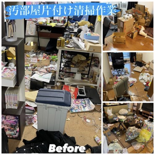 江別市一軒家のゴミ屋敷片付け清掃作業です。部屋が荒れ果てた状態になってしまったのでキレイにして欲しいとの依頼を頂きました。散乱したゴミを分別して搬出、清掃して作業完了となりました。 今回は戸建の一部屋だけの作業になりまし
